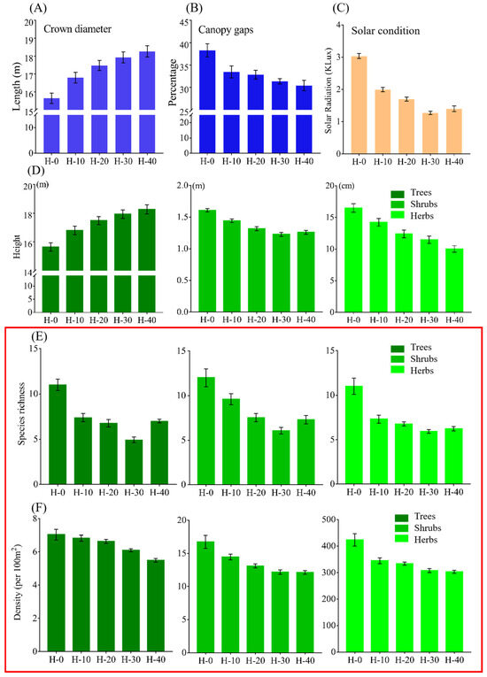 Lastly, the effects of canopy gaps on solar radiation, air temperature and air moisture under the canopy were examined, along with the impacts of these factors on the vertical structure, species diversity and demographic structure of the forest. From April to October 2019, solar radiation, air temperature and air moisture were measured in quadrats described in Figure S2 in H-0, H-10, H-20, H-30 and H-40. A photometer (McCo Technology Co., Ltd., Beijing, China), a thermometer (Jian Da Renke Electronic Technology Co., Ltd., Jinan, China) and a hygrometer (Jian Da Renke Electronic Technology Co., Ltd., Jinan, China) were installed in the center of the quadrat. Solar radiation, heat (air temperature) and water (air moisture) conditions were recorded every 30 min throughout the day from April to October 2019, a period that is important for the growth of plants. Based on the pre-experiment, a 30 min interval effectively captures changes in light intensity while balancing data recording density with storage capacity. For each of the five sites, the average value of solar radiation of days were calculated at 9:30 am (when it reaches its maximum value). Averages for air temperature and moisture condition were also calculated (Table S2). Mantel test [23] was used to analyze four environmental correlates of the plant community structure. An Environment × Site matrix and a Biological variable × Site matrix were built. Environmental factors were size of canopy gaps, solar radiation, air temperature, and air moisture; the biological variables were abundance, height, species richness of herbs, shrubs and trees, and abundance of all saplings and motherless saplings. The values are shown in Table S2. Pairs of environmental factors were compared with Spearman’s correlation tests. All analyses were performed in the R statistics programming environment [24] version 4.1.0 with the package “stats”.