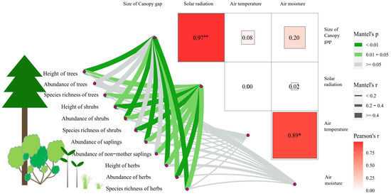The effect of canopy gaps on solar radiation, air temperature and air moisture of the subcanopy and the effect of these factors on the abundance, height and species richness of herbs, shrubs and trees and the abundance of saplings and motherless saplings. The size of canopy gaps had a strong and significantly linear effect on solar radiation below the canopy (Spearman correlation analysis, R2 = 0.94, p < 0.0001), but not on air temperature and air moisture. The abundance, height and species richness of herbs and shrubs were strongly and significantly affected by the size of canopy gaps and solar radiation. The abundance of saplings and motherless saplings and the height and species richness of trees were also affected by canopy gaps and solar radiation. “*” indicates p < 0.05, and “**” indicates p < 0.01.