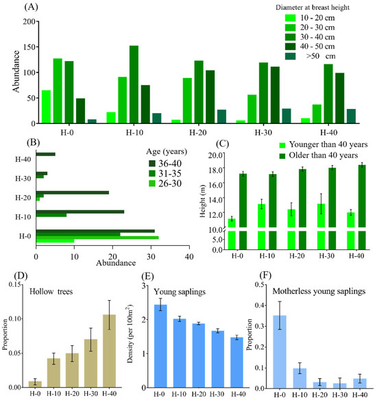 Dominant plant species were consistent in terms of species composition in all habitats (Table S3). The height of trees decreased with increasing size of canopy gaps, while shrubs and herbs showed the reverse trend (Figure 2D; Table S2), indicating a more heterogeneous vertical structure in H-0. Both species richness and abundance of stems of trees, shrubs and herbs increased with the size of canopy gaps (Figure 2E,F). Hence, a wider canopy facilitated an increase in the height, species richness and abundance of shrubs and grasses. The diameter at breast height of trees (Figure 4A) and the height heterogeneity of trees (Figure S3) had a similar structure across the five sites, which shows that the number and proportion of younger trees were smaller in areas where snub-nosed monkeys vanished a long time ago (Figure 4B). The scarcity of trees under the age of 40 in historical habitats could be because they are shorter than older trees (Figure 4C) and narrower canopy gaps may increase the mortality of younger trees [16]. The proportion of hollow trees, an indicator of a tree’s health status, increased with decreasing size of canopy gaps (Figure 4D). The abundance of young saplings (Figure 4E) and the proportion of saplings without their mother trees nearby (Figure 4F) also increased with increasing canopy gaps, which suggests that a wider canopy promotes seedling survival and colonization of opportunistic colonizers [25,26]. In contrast to shrubs and grasses, canopy gaps had a delayed effect on tree density; the density of trees and young saplings at H-10 and H-20 was not significantly lower than at H-0, but that at H-30 and H-40 was. In addition, the monkeys themselves also promote seed dispersal through feeding and moving in this area as proven before [15], resulting in a higher number of young motherless saplings in the current habitat. The height, abundance, and species diversity of shrubs and herbs were strongly and significantly affected by canopy gaps and solar radiation, and the abundance of all saplings and motherless saplings (Figure 3). The height and species richness of trees were also significantly and strongly affected by canopy gaps and solar radiation (Figure 3). Thus, wider canopy gaps visibly improved the heterogeneity of the subcanopy structure and the diversity of trees. These positive effects of ecological engineering decreased 20 years after the monkeys vanished from the ecosystem. This is shown by the fact that the density of trees and young saplings at H-30 and H-40 (but not H-10 and H-20) was significantly lower than in the current habitat (Figure 2F and Figure 4E). For a summary of the above data, see Table S2; for additional statistical details, see Table S4.