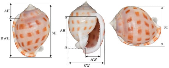 The seven morphometric traits (Figure 2) including shell height (SH), body whorl height (BWH), spire height (SPH), aperture height (AH), aperture width (AW), shell width (SW), and shell thickness (ST) were measured (detail in Table 1) using IP67 digital display Vernier calipers (Deli: Ningbo Deli Group Co., Ltd., Ningbo, China), accurate to 0.01 mm.