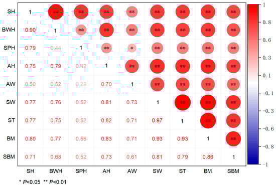 The vast majority of correlation coefficients among the traits in wild S. bisulcatum reached a highly significant level (p < 0.05), indicating the statistical relevance of the selected traits for correlation analysis. The correlation coefficients of various traits were shown in Figure 3. The result showed that the correlation coefficients between the morphological traits and body mass were ranked as follows: ST = SW > AH > SH> BWH > AW > SPH. Among these traits, SH, AH, SW, BWH, AW and ST showed strong correlations (r > 0.7) with body mass, and SPH were moderately correlated (0.4 < r < 0.7).