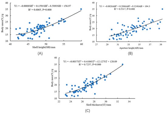 Curve fitting was performed using SPSS 22.0. The significant predictors—SH, AH, ST, and SW—previously identified from two multiple regression models, were employed as independent variables. Separate curve models were fitted with Y1 and Y2 as the dependent variables. As shown in Figure 4 and Figure 5, the optimal fit for the relationships between predictors (SH, AH, ST, SW) and each response variable (body mass, soft body mass) was achieved using cubic polynomial models.