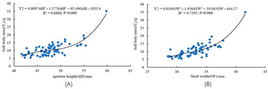 Curve fitting results of the relationships between key morphological traits and soft body mass of S. bisulcatum. (A) modal curve of AH versus oft body mass; (B) modal curve of SW versus soft body mass.