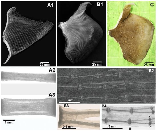 In M. aquila, the number of radials per ray increases progressively from the anterior margin towards the central axis of the fin—up to a maximum of 25 elements—and then decreases symmetrically towards the posterior margin (Figure 1(A1)). In R. asterias, the central rays are the longest and contain the highest number of radials, while there are fewer radials in the anterior region, which is consistent with the smaller surface area (Figure 1(B1)). In this species, the length of the rays decreases regularly from the base of the pterygium to the fin margin. In contrast, in M. aquila the length of the radials from the medial line to the lateral margin remains relatively constant (Figure 1(A1)). Although no morphometric analysis was performed, the comprehensive dorso-ventral radiograph suggests that these structural differences represent stable and distinguishing features between the two species.