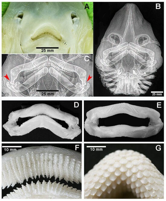 The head of R. asterias is flattened and triangular in shape. The calcified rostrum is covered by both the dorsal and ventral skin, which continues without interruption into the tegument of the left and right pectoral fins. Dorso-ventral X-ray projections show the characteristic inverted V-shape of the rostrum formed by two calcified elements that converge anteriorly into a single point. The mouth is located on the ventral surface (Figure 2A–C). Both the maxilla and mandible consist of two thick, calcified cartilaginous segments connected at midline by a robust fibrous band, forming the curved maxillary and mandibular arches. They are articulated at the lateral ends by ball-and-socket joints. The lateral ends of the upper jaw are bent downwards with an angle of approximately 70° so that the ball of the upper jaw fits securely into the corresponding socket of the lower jaw (Figure 2C). The teeth are distributed over most of the labial surface of both arches, with a lower density on the inner (lingual) surface (Figure 2D,F). The species exhibits sexual dimorphism in tooth morphology: Males have pointed teeth (Figure 2D,F), while females have spherical teeth (Figure 2E,G). Macroscopic details of the pointed teeth and their histological features in R. asterias are presented in Figure 3.