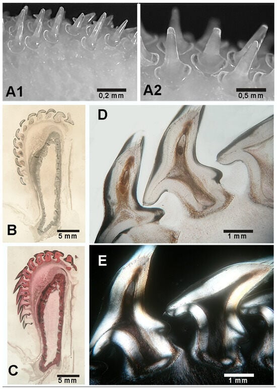 Raja asterias: details of male pointed teeth and their histology. (A1,A2) Enlarged base of pointed teeth leaning on the jaws surface. (B,C) Transverse, un-decalcified section of the lower jaw and teeth ((B) hematoxylin–eosin, (C) methylene blue–acid fucsine). The transversally sectioned teeth extend from the jaw upper edge to the anterior labial surface. The tessellated calcified cartilage pattern of the jaw wall surrounds the “core” of un-calcified cartilage. (D,E) Decalcified, teeth longitudinal sections at higher magnification (hematoxylin–eosin in bright field (D) and in polarized light (E), showing the pulp, the enlarged base leaning on the jaw surface and the tooth root deepening into the jaw calcified cartilage.