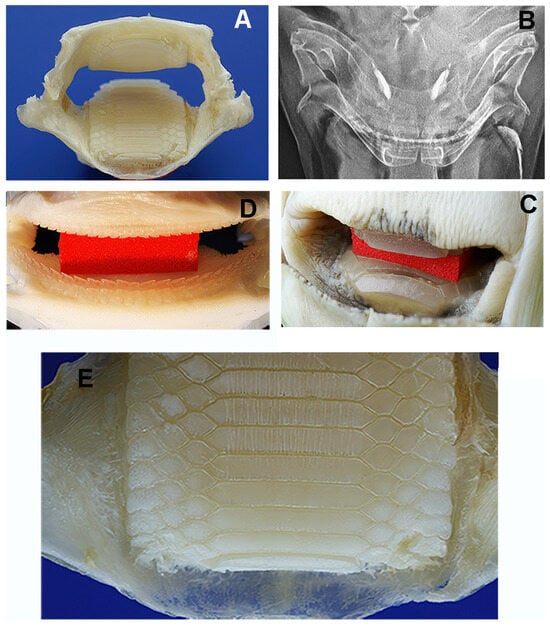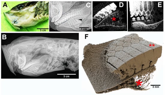 Myliobatis aquila: head and mouth external view, X-rays in lateral projection and micro-CT. (A) Oral cavity and gills exposed by dissection of the pectoral fin, the mouth opening at the anterior lower edge. (B,C) X-rays the lateral view of the head (B) and detail (C) of the symphyseal plates. The flat lower plate comes into contact with the curved upper plate in a narrow, anterior area. The latter are supported by vertical, calcified struts of Meckel’s cartilage segments and the palatal squares, without any contact with the mandibular arches. (D–F) Micro-CT shows the geometry and compactness of the symphyseal plates calcified cartilage. The latter lean on the cortex of the underlying skeletal elements (D–F), which are characterized by a poor calcification density (red asterisk). Load transmission is made on the cortex through distinct, cubic blocks (F). The higher compactness of the plates calcified cartilage is well documented ((D–F) red asterisk). A thin un-calcified cartilage layer (D–F) separates the symphyseal plate from the below skeletal elements (D–F).
