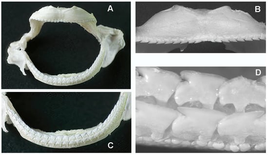 - Underwood, C.J.; Johanson, Z.; Welten, M.; Metscher, B.; Rasch, L.J.; Fraser, G.J.; Smith, M.M. Development and evolution of dentition pattern and tooth order in the skates and rays (Batoidea; Chondrichthyes). PLoS ONE 2015, 10, e0122553. [Google Scholar] [CrossRef] [PubMed]
