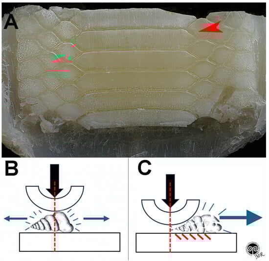 Myliobatis aquila: crushing mechanism of the symphyseal plates. (A) Elongated, parallel scratches are evident on the lower plate dorsal surface, where jaws adduction develops the highest compressive force with the curved, upper plate. (B,C) Shell fragments can be pushed forward or backward to the digestive tract by the same compressive force or by the hydrodynamic water flow in the mouth.
