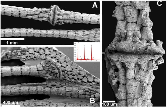 Raja asterias: SEM-morphology of fins and joints and EDAX analysis of the mineralized phase. (A) Radials’ columnar pattern and inter-radials joint: EDAX analysis documenting Ca3(PO4)2 spectrum. (B) Tesseral “mosaic” pattern of pterygium and pterygial-first radial joint. (C) Detail of inter-radial joint showing the joint disk plate and the chondrocyte lacunae opening on the external surface of the calcified cartilage elements.