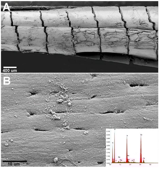 Sparus aurata (teleost) pectoral fin. (A) SEM morphology with aligned cylindrical units with a compact, smooth surface. (B) Few, flat osteocyte lacunae open on the external surface and EDAX confirming Ca3(PO4)2 spectrum of the calcified bone matrix.