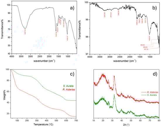 Physicochemical comparative analyses of fins from S. aurata (Teleost) and R. asterias (Chondrichthyes): (a) FT-IR spectrum of S. aurata; (b) FT-IR spectrum of R. asterias; (c) thermogravimetric curves related to S. aurata (green) and R. asterias (red); (d) XRD pattern comparison between R. asterias (red) and S. aurata (green). No significant (or minimal) differences were observed between the Ca3(PO4)2 mineral phase in the Teleost bone matrix and the calcified cartilage matrix of the Chondrichthyes, indicating a comparable mineral deposition.