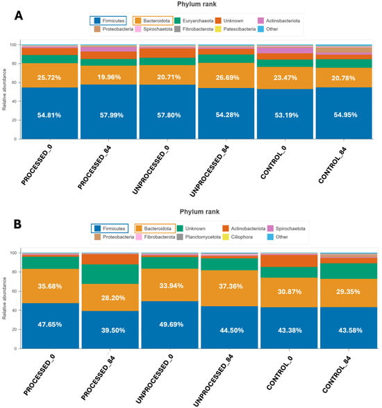 Based on the bar plots representing microbial relative abundances at the phylum level using the two primer pairs (full 16S and prokaryotic), we observed consistent trends across the three treatment groups (processed, unprocessed, and control) over 0 and 84 days of the feeding trial. When comparing the phylum-level profiles from both primer sets, the dominant bacterial phyla were Firmicutes and Bacteroidota across all groups. However, the prokaryotic primer pair (Figure 1A) detected a higher relative abundance of Firmicutes (ranging from 53.19% to 57.99%) and lower Bacteroidota (19.96–26.69%) compared to the full 16S primer set (Figure 1B), where Firmicutes ranged from 39.50% to 49.69% and Bacteroidota showed relatively higher proportions (28.20–37.36%). These discrepancies suggest primer-specific biases in taxonomic recovery, emphasizing the need for adjusting primer selection according to the targeted microbial community.