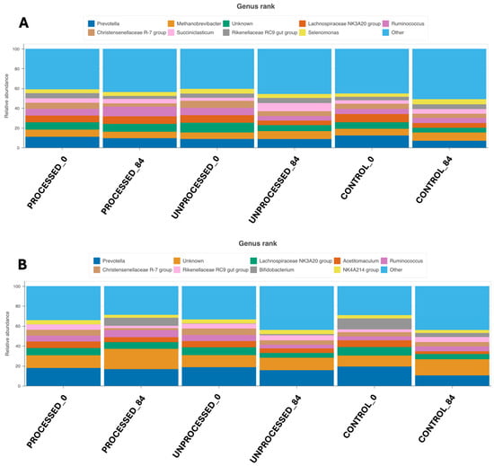 For taxonomic classification of bacterial and archaeal populations, the bioinformatics workflow ‘wf-16S’ through the open-source platform EPI2ME (Oxford Nanopore Technologies plc., https://epi2me.nanoporetech.com/wfindex/ (accessed on 5 September 2024)) and the database SILVA 138 SSU Ref non-redundant (NR) (https://www.arb-silva.de/documentation/release-123 (accessed on 5 September 2024)) were used, setting 95% as a similarity threshold for successful assignment. For each primer pair, the 36 sequenced PCR products were pooled (one group per sextuplicate) according to feeding trial (groups Control, Processed and Unprocessed) and sampling days (0 and 84) information. In total, six sample groups were created, namely: Control_0, Processed_0, Unprocessed_0, Control_84, Processed_84 and Unprocessed_84. Visualisation of the microbial community composition and abundance in each sample group was achieved by constructing separate taxa bar plots for each primer set with the aforementioned ‘wf-16S’ workflow.