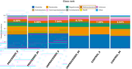 A notable distinction between the two primer pairs used herein was the exclusive detection of Methanobacteria using the prokaryotic primer pair, where it comprised up to 8.84% of the total microbial community. More specifically, it ranged from 6.86% in the Processed_84 group to 8.84% in the Control_84 group. These results indicate that this primer set effectively captured archaeal taxa. In contrast, Methanobacteria were entirely absent when the full-length 16S primer pair was used, suggesting a limited detection capacity for archaeal lineages using the specific primer set (Figure 3).