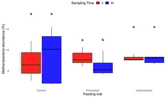 Linear Mixed Model analysis for Methanobacteria abundance (%) by treatment (Control, Processed, Unprocessed) and sampling time (0, 84), superscripts a, b differ at p < 0.05.