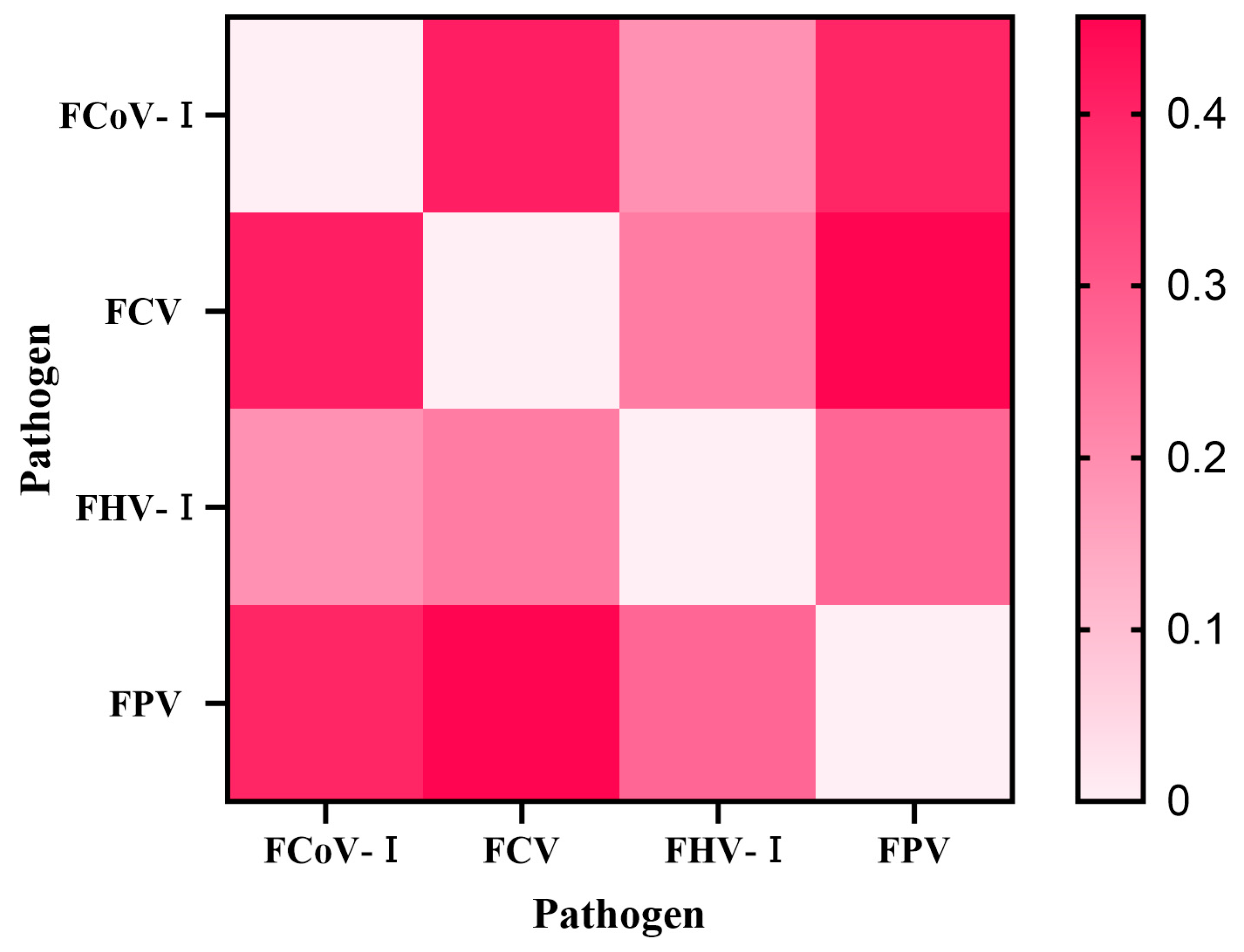 Pairwise association analysis revealed specific patterns: the high Jaccard index between FCV and FPV (0.456) suggests frequent co-detection, possibly due to shared fecal-oral transmission and environmental stability, which are well-documented for both viruses [