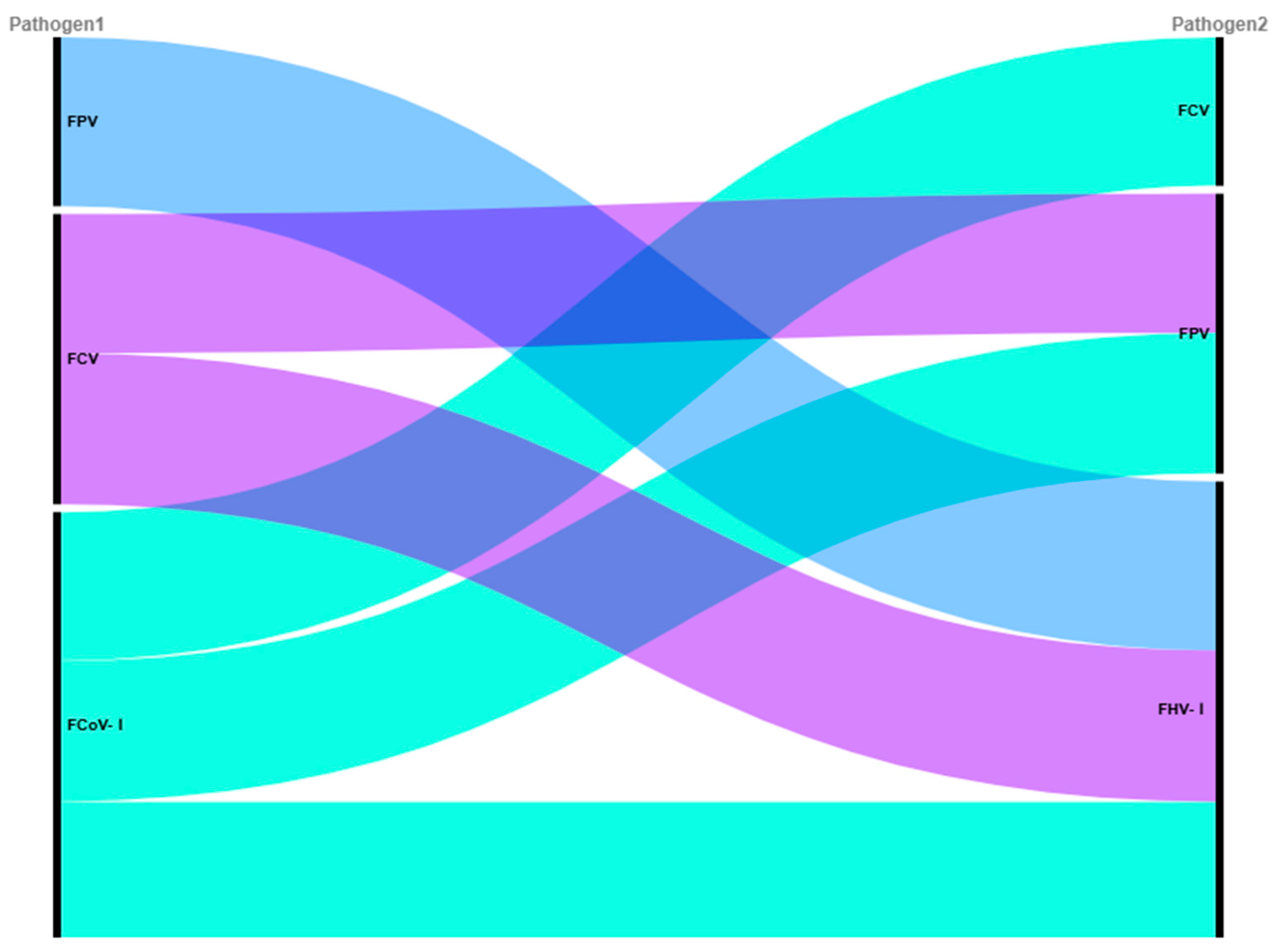 51]. The most frequent triple co-infection combination involved FCV, FPV, and FCoV-I (12.70%), likely driven by their high individual prevalence and facilitated by the high mobility of stray cats, which amplifies exposure opportunities.