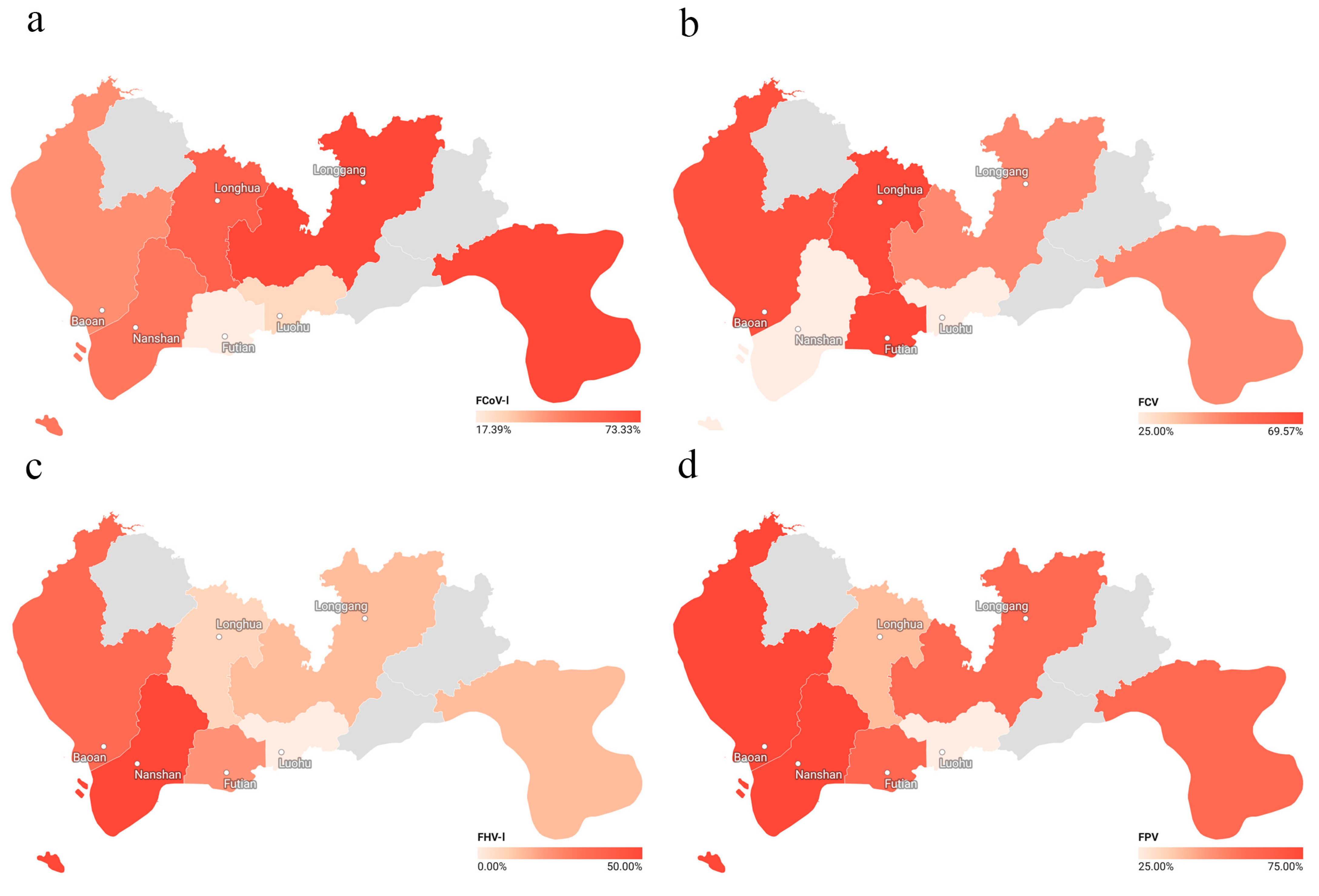 Geospatial analysis showed significant heterogeneity in infection rates across districts. For instance, FCoV-I prevalence was significantly higher in Longgang than in Futian, even after multiple-testing correction. This spatial clustering suggests that localized environmental, ecological, or anthropogenic factors drive transmission dynamics, a phenomenon observed in other urban animal disease systems [