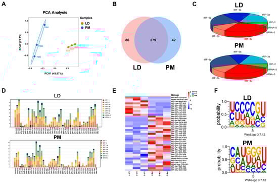 The overview of tRFs and tiRNA expression in the LD and PMs. (A) The principal component analysis (PCA) of tRFs and tiRNAs expressions in LD and PM samples. (B) Venn diagram of tRFs and tiRNAs expression in muscle samples from both groups. (C) Distribution of different types of tRF and tiRNA in two groups of muscle samples. (D) Stacked plot of all isoforms of tRFs and tiRNAs clustered by tRNA anticodons. The x-axis represents tRNAs with the same anticodon, while the y-axis shows the number of all isoforms of tRFs and tiRNAs originating from the respective anticodon tRNA. (E) The clustering heatmap of differentially expressed tsRNAs in samples of the LD and PM. (F) Seed sequence characteristics of differentially expressed tsRNAs.