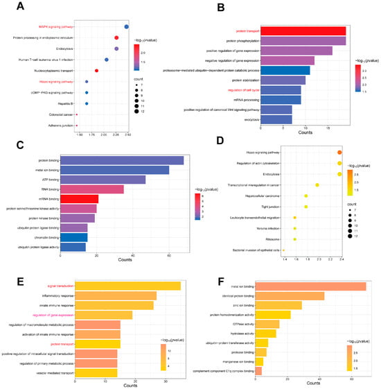 Enrichment analysis of the top 10 tsRNAs in the LD and PM of QingYu pigs. (A) The top 10 signaling pathways enriched with the target genes of the top 10 tsRNAs in PM. We have highlighted the key terms in red for emphasis. (B) The top 10 BP enriched with the target genes of the top 10 tsRNAs in PM. We have highlighted the key terms in red for emphasis. (C) The top 10 MF enriched with the target genes of the top 10 tsRNAs in PM. (D) The top 10 signaling pathways enriched with the target genes of the top 10 tsRNAs in LD. (E) The top 10 BP enriched with the target genes of the top 10 tsRNAs in LD. We have highlighted the key terms in red for emphasis. (F) The top 10 MF enriched with the target genes of the top 10 tsRNAs in LD.