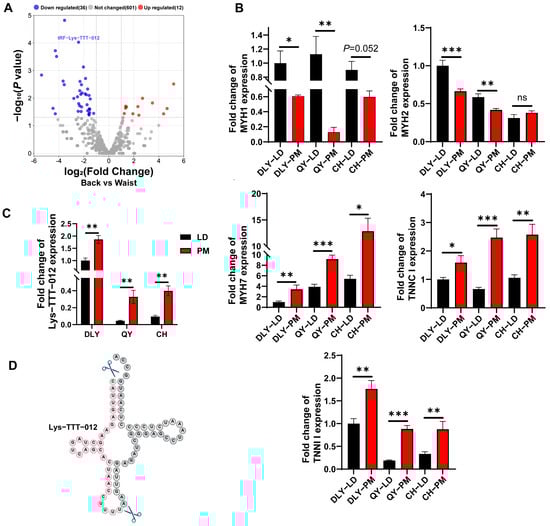 tRF-Lys-TTT-012 highly expressed in PM. (A) Volcano plot of differentially expressed tsRNAs in the LD and PMs. Lys-TTT-012 is highlighted in the plot. tRFs and tiRNAs are represented by red dots (indicating upregulation) or blue dots (indicating downregulation) above the dashed line, while gray dots represent tsRNAs with no significant differential expression. (B) The relative quantification of fast- and slow-twitch muscle fiber markers in the LD and PM of Duroc x Landrace x Yorkshire (DLY) pigs, Qingyu (QY) pigs, and Chenghua (CH) pigs was performed using qRT-PCR. (C) The quantification of tRF-Lys-TTT-012 was conducted in two muscle tissues from three pig species. (D) The shear site map of tRF-Lys-TTT-012 derived from tRNA-Lys-TTT. All data were presented as mean ± SEM. The symbol * denotes a significance level of * p < 0.05, ** p < 0.01, *** p < 0.001, ns indicates no significance.