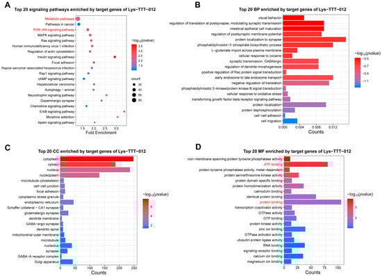 Enrichment analysis of target genes of tRF-Lys-TTT-012. (A) The top 20 signaling pathways enriched with the target genes of tRF-Lys-TTT-012. (B) The top 20 BP enriched with the target genes of tRF-Lys-TTT-012. (C) The top 20 CC enriched with the target genes of tRF-Lys-TTT-012. (D) The top 20 MF enriched with the target genes of tRF-Lys-TTT-012. We have highlighted the key terms in red for emphasis.