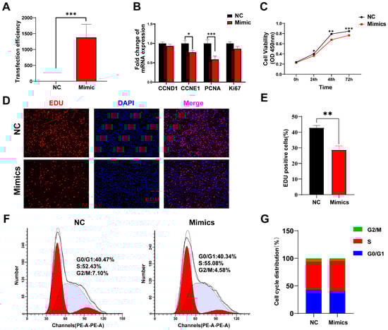 To investigate the function of tRF-Lys-TTT-012 in skeletal muscle, we designed RNA mimics of tRF-Lys-TTT-012 and transfected mimics into C2C12 myoblasts to increase tRF-Lys-TTT-012 expression in order to probe the biological function of tRF-Lys-TTT-012 in C2C12 myoblasts (Figure 6A). Building on our preliminary analysis of its potential functions, we assessed the impact of Lys-TTT-012 on the proliferation of C2C12 cells. The overexpression of tRF-Lys-TTT-012 significantly reduced the cell cycle protein E1 (CCNE1, p < 0.05) and resulted in a highly significant reduction in the mRNA levels of proliferating cell nuclear antigen (PCNA, p < 0.001). Moreover, for other proliferation-related genes such as CCND1 and Ki67, the mRNA levels also exhibited a decreasing trend (Figure 6B). CCK-8 and EDU assays further demonstrated that the overexpression of tRF-Lys-TTT-012 significantly inhibited the proliferative activity of C2C12 cells and reduced the number of proliferating cells (Figure 6C–E). Additionally, we investigated the cell cycle arrest of C2C12 cells using flow cytometry and observed that the overexpression of tRF-Lys-TTT-012 induced G1/S phase arrest in C2C12 myoblasts, leading to a decrease in cell proliferation viability. (Figure 6F,G). Collectively, our data results suggested that the overexpression of tRF-Lys-TTT-012 hindered C2C12 myoblasts proliferation, mainly attributed to the blockage of G1/S transition.