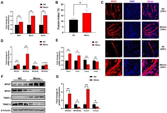 Overexpression of tRF-Lys-TTT-012 promotes the differentiation of C2C12 myoblasts and the transition to slow muscle fibers in vitro. (A) The effect of tRF-Lys-TTT-012 overexpression on the relative mRNA expression of myofiber type-related marker genes during C2C12 cell differentiation. (B) Histogram showing quantitative results of multinucleated myotubes in immunofluorescence assay. (C) Immunofluorescence staining of MYHC with anti-MYH7 antibody in C2C12 cells 6 days after differentiation. Scale: 1 bar represents 100 μm or 200 μm. The immunofluorescence images for Myh7 quantities were analyzed using ImageJ software. (D) The effect of tRF-Lys-TTT-012 overexpression on the relative mRNA expression of myofiber type marker genes during C2C12 cell differentiation. (E) The effect of tRF-Lys-TTT-012 overexpression on the relative mRNA expression of troponin marker genes during C2C12 cell differentiation. (F) The effect of tRF-Lys-TTT-012 overexpression on the relative protein expression of troponin marker genes during C2C12 cell differentiation. (G) Histogram showing quantitative results of the relative protein expression of troponin marker genes. All data were presented as Mean ± SEM. The symbol * denotes a significance level of p < 0.05, ** p < 0.01, ns indicates no significance. The relative mRNA levels are normalized to β-actin. NC, Negative control; Mimics, tRF-Lys-TTT-012 mimics.
