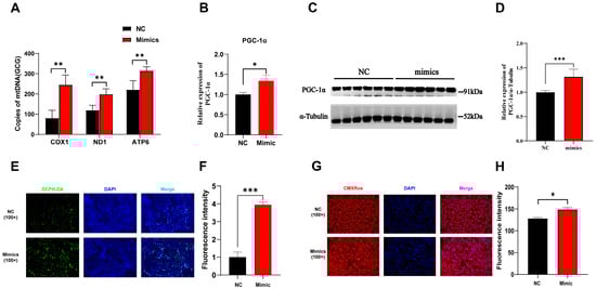 Overexpression of tRF-Lys-TTT-012 increases mitochondrial content and promotes mitochondrial function in vitro. (A) The effect of mitochondrial copy number after overexpression of Lys-TTT-012. (B) The relative mRNA expression of PGC-1α after tRF-Lys-TTT-012 overexpression in C2C12 cells. (C,D) The change in protein levels of PGC-1α after overexpression of tRF-Lys-TTT-012. (E) Immunofluorescence analysis depicting the effect of tRF-Lys-TTT-012 overexpression on fluorescence intensity related to mitochondrial reactive oxygen species in PK15 cells. (F) Quantification of fluorescence intensity corresponding to mitochondrial reactive oxygen species staining in PK15 cells with tRF-Lys-TTT-012 overexpression using the ImageJ software. (G) Mitochondrial fluorescence staining showing the impact of tRF-Lys-TTT-012 overexpression on mitochondrial content within PK15 cells. (H) Quantification of mitochondrial content using the ImageJ software based on fluorescence intensity in PK15 cells with tRF-Lys-TTT-012 overexpression. All data were presented as Mean ± SEM. The symbol * denotes a significance level of p < 0.05, ** p < 0.01, *** p < 0.001. The relative mRNA levels are normalized to β-actin. NC, negative control; Mimics, tRF-Lys-TTT-012 mimcis.