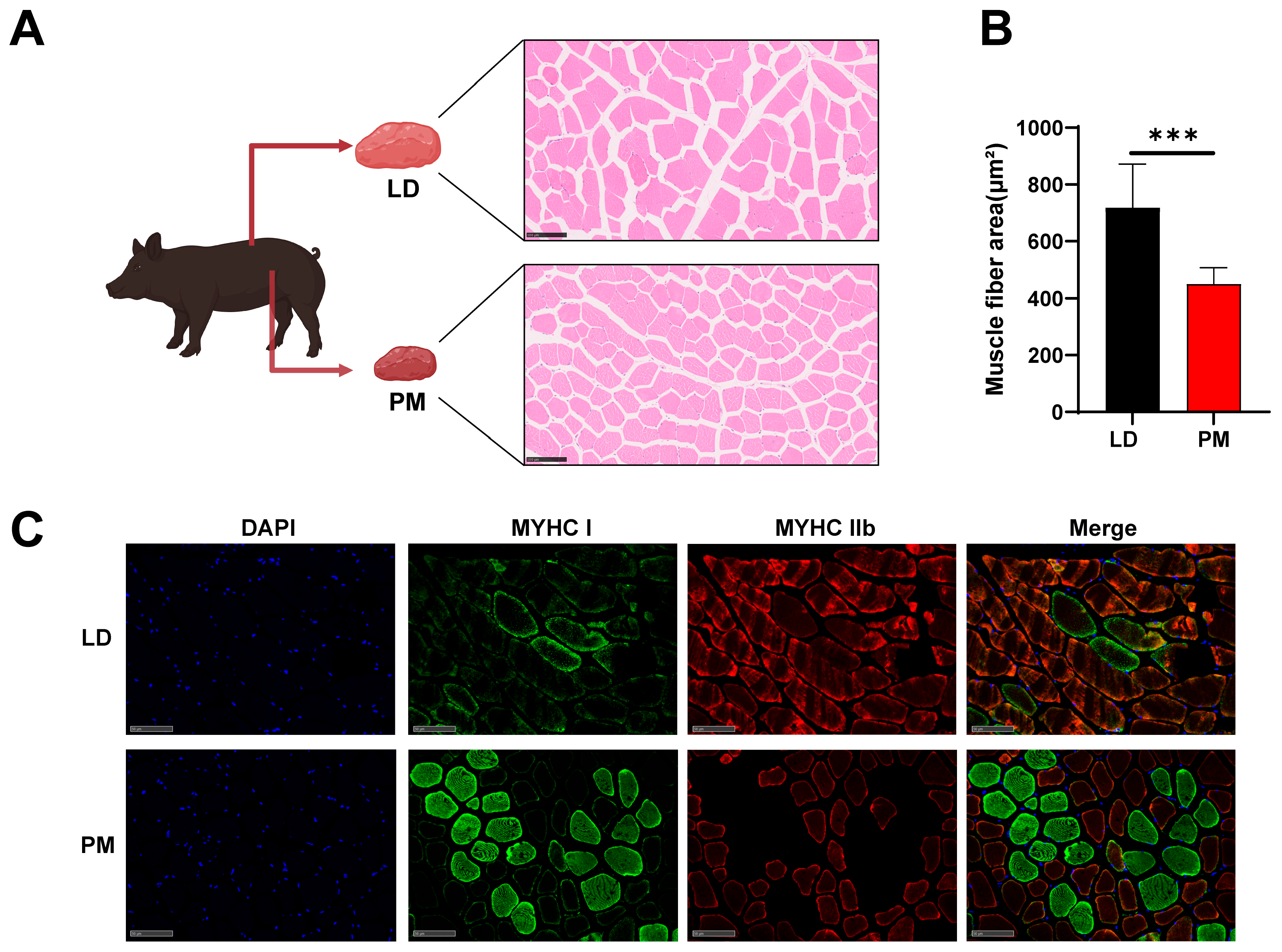 3.1. Differences in Muscle Fiber Type Composition Between LD and PM in Pigs
