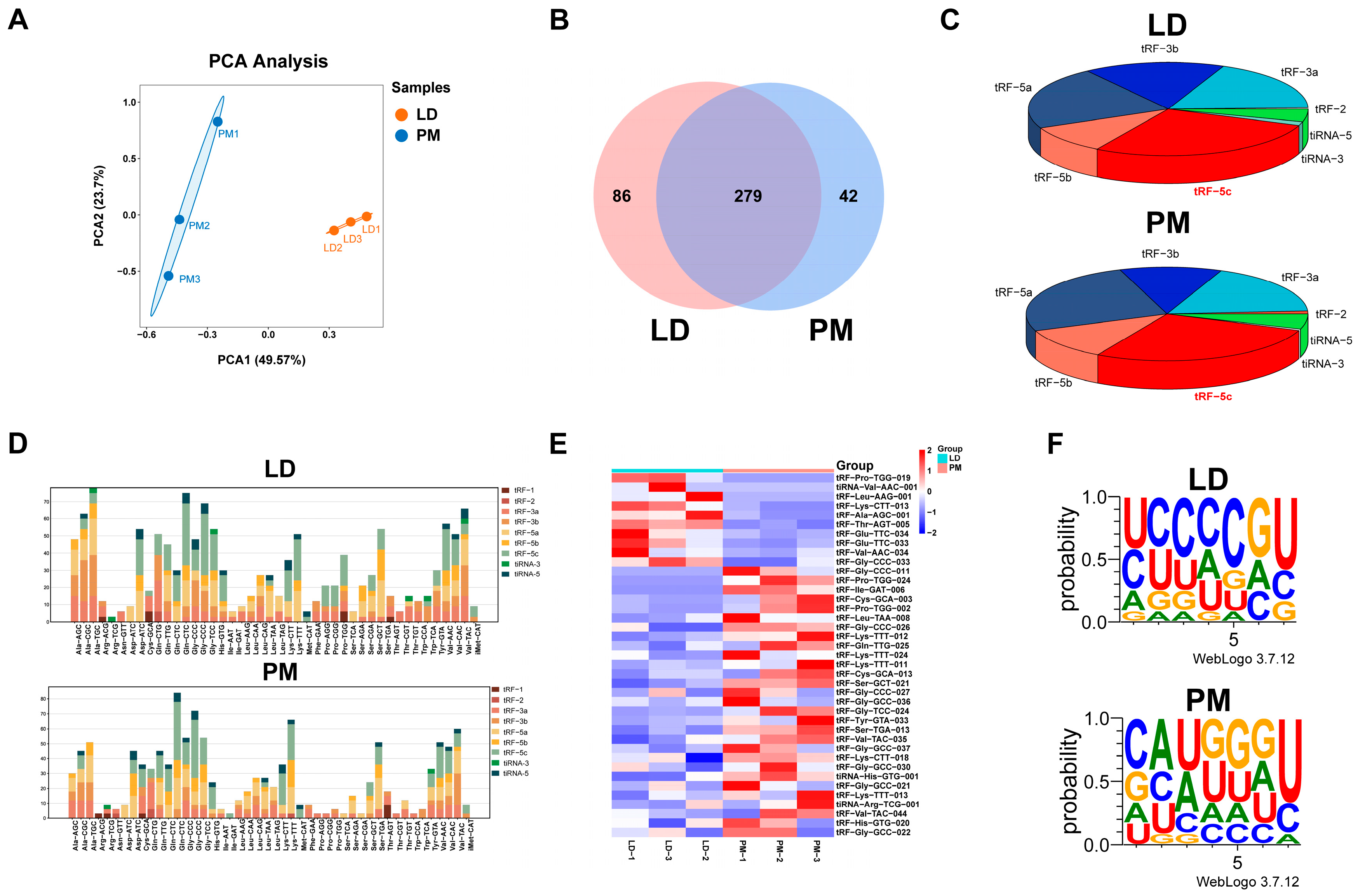 3.2. Types of tRFs and tiRNAs Are Differentially Expressed in LD and PM