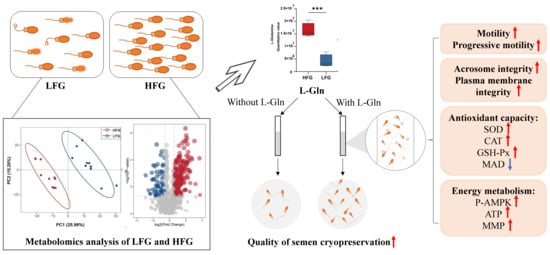 Yang, B.; Liu, L.; Wang, N.; Zhou, Z.; Zhang, Z.; Li, Y.; Zan, L.; Yang, W. L-Glutamine Supplementation Improves the In Vitro Qualitative Parameters of Cryopreserved Qinchuan Bull Sperm. Animals 2025, 15, 3052. https://doi.org/10.3390/ani15203052