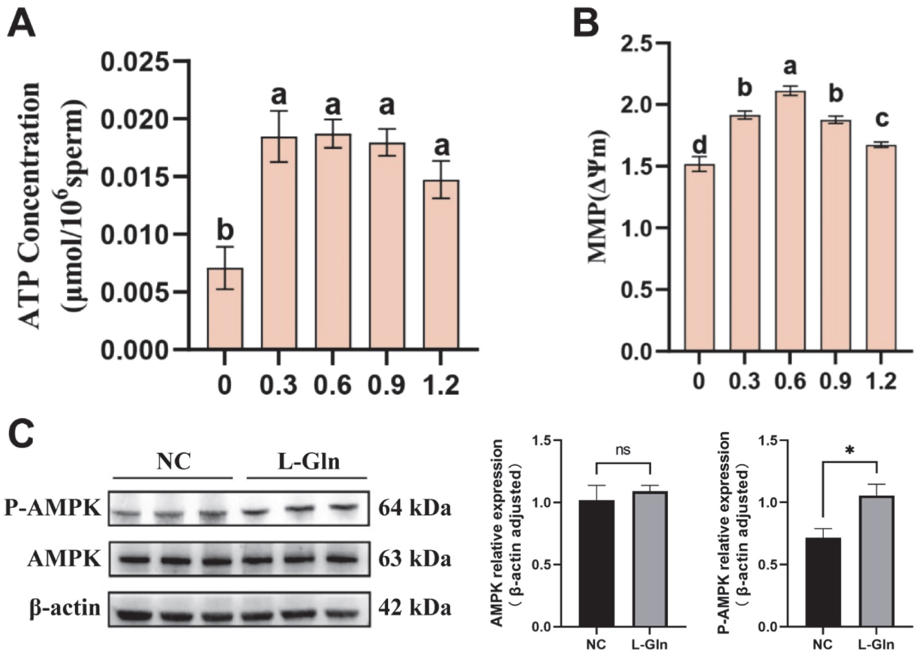 3.8. Effect of L-Glutamine on Energy Metabolism and AMPK Phosphorylation in Frozen–Thawed Sperm