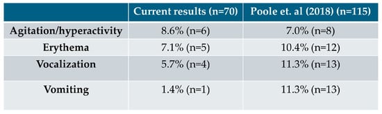 Regarding adverse effects, specifically erythema, it is important to note that mirtazapine (Mirataz, Dechra) contains macrogol 3350 as an excipient SPC) [9]. The presence of PEG 3350 in this ointment may contribute to the occurrence of erythema, as these compounds have been associated with allergic reactions, including skin irritation and erythema in some individuals [18]. Regarding vomiting, it would have been valuable to better differentiate between true vomiting and regurgitation, as increased appetite stimulation may lead some cats to eat too quickly and subsequently regurgitate rather than vomit. Additionally, differentiating vomiting associated with the underlying condition from vomiting potentially related to mirtazapine (Mirataz, Dechra) administration would have provided a clearer understanding of the drug’s adverse effects. Side effects were reported by 20% cat owners (14/70), with agitation/hyperactivity being the most frequent. Compared to Poole et al. (2018) [15], where agitation/hyperactivity occurred in 7%, erythema in 10.4%, and vocalization and vomiting in 11.3%, our study showed a slightly higher percentage of agitation, lower percentages of erythema and vocalization, and a markedly lower incidence of vomiting (1.4% vs. 11.3%). This comparison highlighted differences between our findings and previous clinical studies, providing insight into the real-world use of transdermal mirtazapine in cats.