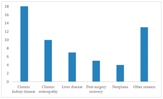 Among 57 responses detailing underlying diseases (81% of 70), the most frequent causes of anorexia were: