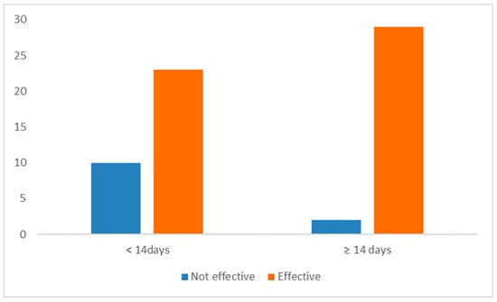 Responses on treatment duration were categorized into two groups: ‘<14 days’ (51.6%, 33/64) and ‘≥14 days’ (48.4%, 31/64). A statistically significant association (p = 0.015) was observed between treatment duration and perceived efficacy. Owners administering treatment for ≥14 days reported a higher positive outcome (93.5%) compared to those administering it for <14 days (69.7%) (Figure 4).