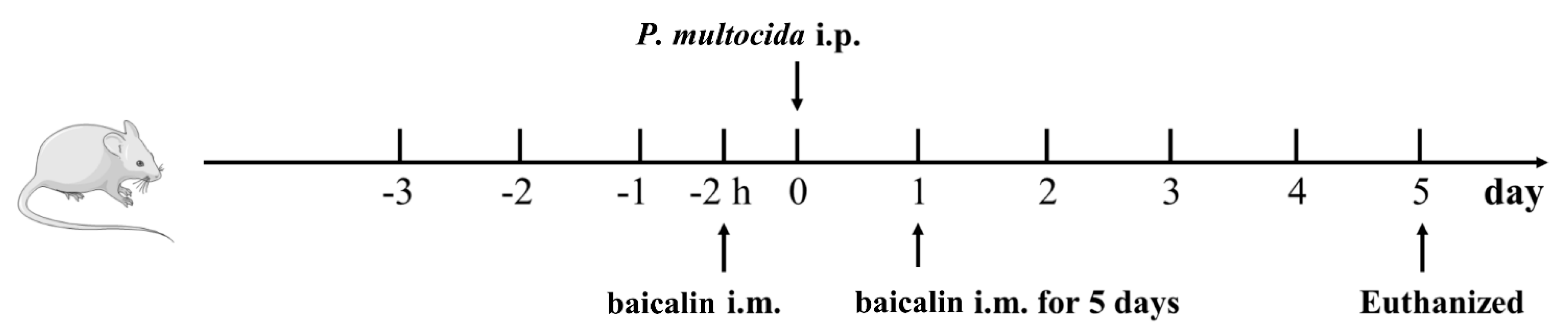 Zhang, D.; Zhao, C.; Xue, Y.; Lu, Q.; Liu, Y.; Xiong, J.; Ye, C.; Fu, S.; Wu, Z.; Qiu, Y.; et al. Baicalin Mitigates Pasteurella multocida-Induced Pulmonary and Vascular Injury via NLRP3/COX-2 Inhibition in Mice. Animals 2025, 15, 3055. https://doi.org/10.3390/ani15203055