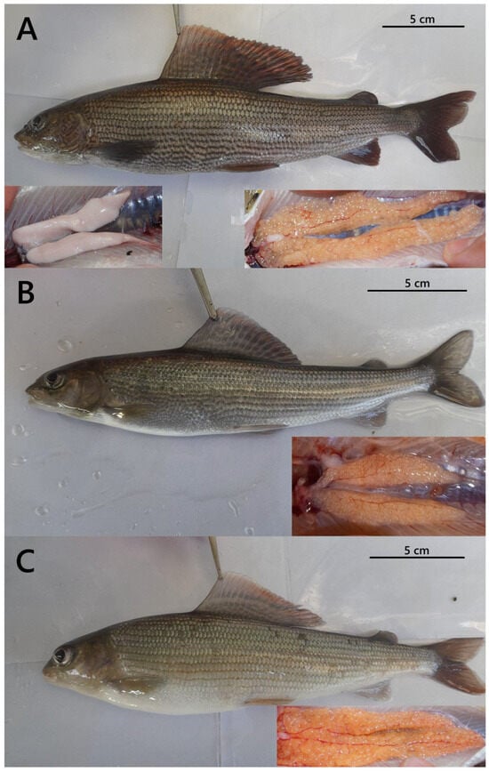 The external sexual dimorphism analysis was performed following the procedure outlined by Witkowski [28]. Fish were classified as males if they displayed breeding tubercles on the posterior part of the body, dark body coloration, a large cherry-colored dorsal fin, and a small genital papilla. Females were identified by a small dorsal fin, light body coloration, and a large genital papilla. In turn, fish exhibiting a silvery body and lacking a genital papilla were classified as indeterminate. The external sexual dimorphism analysis was confirmed through the morphological observation of the dissected gonads. Males were identified by the presence of paired, elongated testes with a milky or whitish appearance, females by paired, lobulated ovaries containing visible oocytes, and sterile individuals by rudimentary, thread-like gonads lacking differentiated gametes. For data collection, all fish and their gonads were photographed with a Canon G16 camera (Canon, Tokyo, Japan). Each image was visually inspected to identify and characterize every distinct sex identified among the examined fish. Images were captured on a neutral gray background with consistent LED lighting to avoid shadows, and a scale bar was included in each frame. Camera settings were standardized with ISO 200, aperture f/5.6 and magnification adjusted to capture the entire specimen or gonad. No automated image analysis software was used. All images were visually inspected to identify and characterize each distinct external sexually dimorphic phenotype among the examined fish.