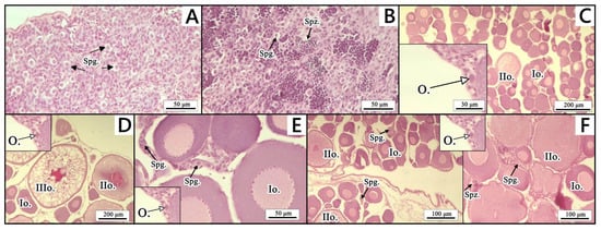 Gonadal development in the control group (MTC) and two experimental groups (MT3ppm and MT6ppm) based on histological sections stained with hematoxylin and eosin (H&E). (A) Testes—spermatogonia type A; (B) testes—spermatogonia type A and spermatozoa; (C) ovaries—oogonia and oocyte type I and II; (D) ovaries—oogonia and oocyte type I, II and III; (E) ovaries—oogonia, oocyte type I and II, and single spermatogonia; (F) ovaries—oogonia, oocyte type I, II, and III, single spermatogonia, and spermatozoa. (Spg.—spermatogonia type A; Spz.—spermatozoa; O.—oogonia; Io.—oocyte type I; IIo.—oocyte type II; IIIo.—oocyte type III).