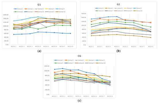 Variation in milk yield according to feeding strategies for (a) G1; (b) G2; (c) CG.