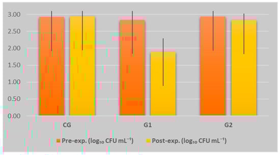 In the present study, the analysis of total viable counts (TVC) obtained before and after the experimental period for the three groups provided valuable information regarding the influence of the feeding protocol on milk hygiene (Figure 2). The total viable count (TVC) was expressed in logarithmic units as log CFU mL−1, representing the base 10 logarithm of the number of colony-forming units per millilitre of milk, in accordance with microbiological standards used to assess the hygienic quality of dairy products [].