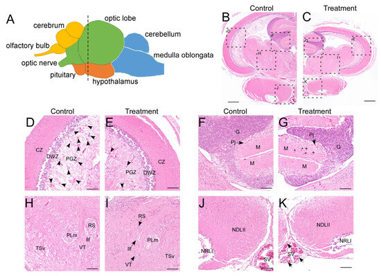 Histopathological analysis of the brain. (A) schematic of the LMB brain (lateral view). Different brain regions are marked with colors: yellow for the telencephalon, green for the mesencephalon, orange for the diencephalon, and blue for the rhombencephalon. The dotted line marks the location of the transverse sections in the entire brain; (B–K) H&E staining of the brain in control and treatment groups. (D) and (E), (F) and (G), (H) and (I), (J) and (K) are enlarged views of different regions in (B) and (C), showing the optic tectum, cerebellum, ventral tegmentum, and hypothalamus, respectively. CZ, central zone of the optic tectum; DWZ, deep white zone of the optic tectum; G, granular layer of the cerebellum; llf, lateral longitudinal fascicle; M, molecular layer of the cerebellum; NDLII, lateral part of the diffuse nucleus of the inferior lobe; NRLI, lateral part of the nucleus of the lateral recess; PGZ, periventricular gray zone of the optic tectum; Pj, purkinje cells; PLm, medial part of perilemniscular nucleus; RS, superior reticular nucleus; SV, saccus vasculosus; TSv, ventral part of semicircular torus; VT, ventral tegmental nucleus. Arrow heads in (D,E) indicate the radial glial cell clusters in PGZ. Asterisks indicate blood cells, and plus signs denote suspected granule cells in (G). Arrows in (K) point to melanomacrophages. Scale bars: 400 μm in (B,C), 100 μm in (D–K). The cytoarchitecture of the LMB brain was referenced according to Ref. [42].