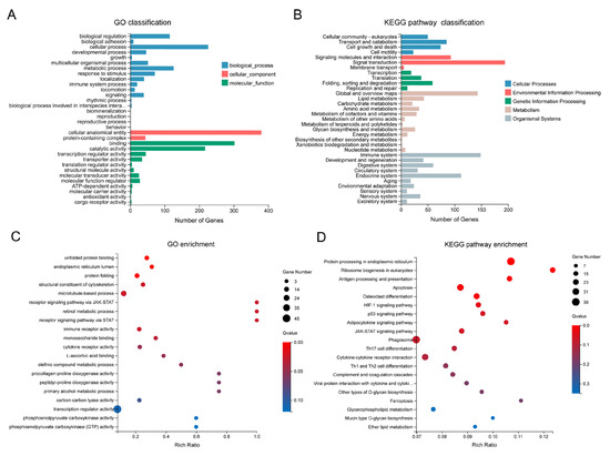 GO and KEGG analysis of the DEGs. (A) GO classification of the DEGs; (B) KEGG pathway classification of the DEGs; (C) GO enrichment analysis of the DEGs. The top 20 enriched GO terms are displayed, with dot size indicating the number of genes in each term and color representing the enrichment FDR (q-value); (D) KEGG pathway enrichment analysis of the DEGs. The top 20 enriched KEGG pathways are shown, with dot size indicating the number of genes in each pathway and color representing the enrichment FDR.