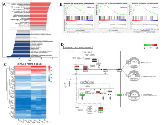 Immune-related genes and pathways. (A) the top 20 significantly up-regulated (red) and down-regulated (dark blue) gene sets identified by GSEA of the transcriptomic data based on KEGG pathway annotations (p-value < 0.05, FDR < 0.25). The normalized enrichment score (NES) for each pathway was calculated and is displayed in the histogram; (B) GSEA enrichment plots of the three up-regulated immune-related pathways; (C) Heatmap of the identified DEGs associated with the immune system. Colors represent the FPKM values of each gene; (D) The significantly enriched immune-related pathways in the context of DEGs. The color coding indicates the log2FC value of each gene, with red denoting up-regulated genes and green denoting down-regulated genes.