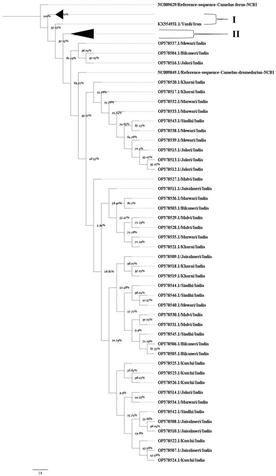 The maximum clade credibility tree indicates the phylogenetic relationship of the mitochondrial D loop dataset. Each node represents percent posterior probability values. The nodes corresponding to D-loop sequences from (I) Iran and (II) the Arabian Peninsula were collapsed for better visualization of the tree. The scale bar indicates the branch length. NCBI reference sequences for the D-loop region of Camelus ferus and Camelus dromedarius were incorporated to enhance the reliability of the tree.