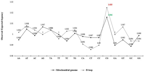 Analysis of relative dinucleotide abundance in mitochondrial genome and D-loop sequence dataset. The line chart shows the mean observed/expected (O/E) frequency ratio for 16 dinucleotides.
