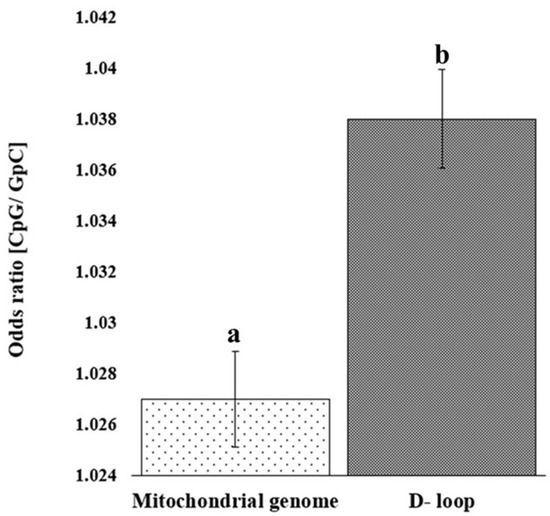 Bar chart depicting the relative abundance of CpG in the D-loop sequence and mitochondrial genome. Error bar showing standard deviation. Bars with different superscripts differ significantly (p < 0.05).