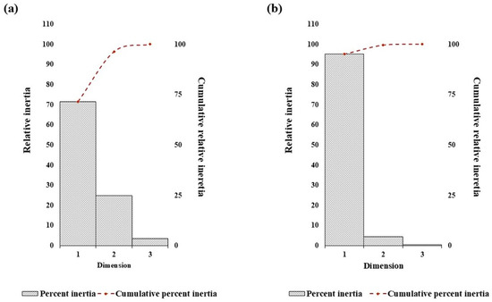 The trend of percent relative and cumulative inertia on the nucleotide composition in the dromedary D-loop sequence with respect to (a) nucleotide repeats and (b) distance distribution by correspondence analysis.