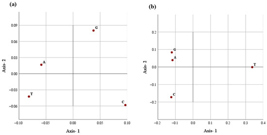 A similar correspondence pattern was observed for the spatial distribution of all four nucleotides (Figure 4b and Figure 5b). The G- and C- appear to spread along the primary axis, reflecting their higher variability in repeat frequency. Conversely, A- and T-nucleotides showed a tendency of close clustering, suggesting a more uniform repeat occurrence across breeds. Axis-1 accounted for a higher variation (95.2%), with Axis-2 contributing 4.4%, explaining 99.6% of the total inertia. The analysis indicates a dominant and consistent trend of nucleotide placement across the mitochondrial D-loop in different Indian dromeadry breeds.